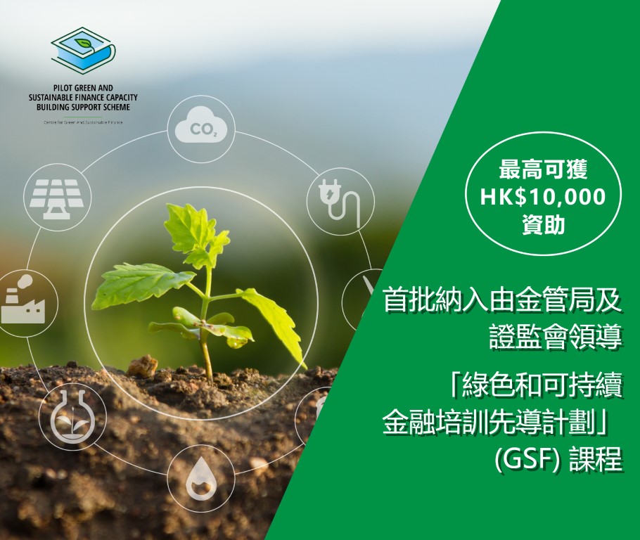 首批納入由金管局及證監會領導 「綠色和可持續金融培訓先導計劃」(GSF) 課程 最高可獲HK$10,000資助