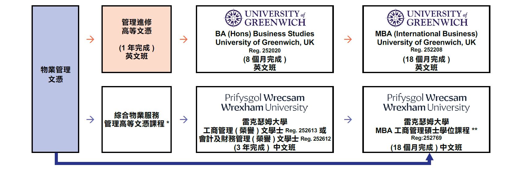 學員成功修畢『物業管理文憑』課程後可繼續升讀『綜合物業服務管理高等文憑』課程或『管理進修高等文憑』以及相關學位課程。