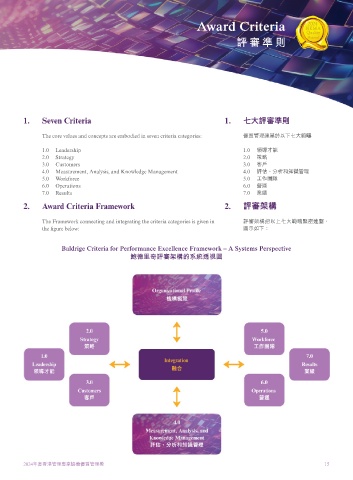 The Framework connecting and integrating the criteria categories is given in 評審架構把以上七大範疇緊密連繫,